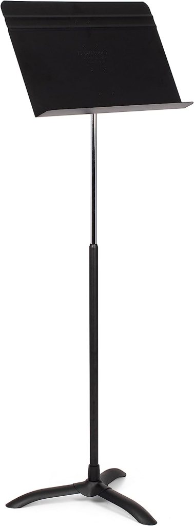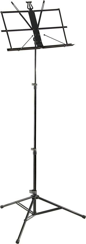 A sturdy, compact folding music stand. Any model is okay, difference is in width of the base
